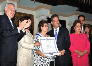 Santo Domingo, República Dominicana.-El presidente Leonel Fernández impuso este jueves la medalla al mérito de la Mujer a 10 damas, en reconocimiento a su labor realizada en distintas áreas del quehacer social, político y económico, y condecoró con la Orden al Mérito de Duarte, Sánchez y Mella en el Grado de Gran Cruz Placa de Plata, a Gladys Gutiérrez, por sus aportes a la lucha por la democracia en el país.
