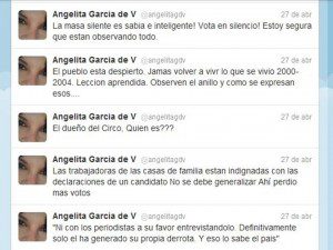 SANTO DOMINGO.- Angelita García de Vargas, esposa del presidente del Partido Revolucionario Dominicano (PRD), Miguel Vargas Maldonado, arremetió este sábado contra el candidato presidencial de esa organización política, Hipólito Mejía Domínguez, a través de su cuenta en la red social twitter.