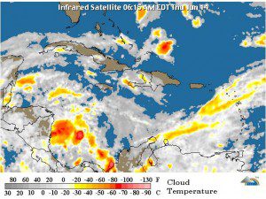 Mientras tanto hoy, no se prevén que ocurran lluvias sobre el territorio, con excepción de la cordillera central y algunos poblados de la zona fronteriza, donde podrían ocurrir chubascos aislados por los efectos locales de convección y orografía.
