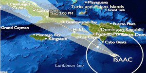 El Centro Nacional de Huracanes (CNH) de Estados Unidos detalló hoy en su boletín de las 15.00 GMT que el centro de «Isaac» se encuentra a 16,3 grados de latitud norte y 70,8 grados de longitud oeste, a unos 300 kilómetros a sur-sureste de Puerto Príncipe y a unos 265 kilómetros al sur-suroeste de Santo Domingo.