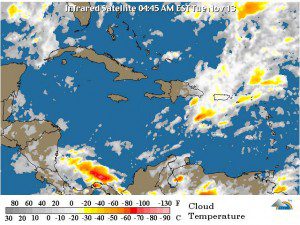 Esta tarde continuarán ocurriendo chubascos dispersos hacia la mitad Este del país, debido a la nubosidad que está generando la cercanía de una vaguada localizada sobre el canal de La Mona. Esta vaguada se mantendrá con un movimiento lento durante las próximas 48 horas. Estos chubascos serán más frecuentes a media tarde y la noche, concentrados hacia la Llanura Costera del Caribe y las regiones Este y Noreste.
