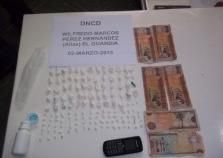 Según la DNCD, este individuo dirigía un punto de venta de drogas propiedad de un sujeto apodado “El Bizco”. Fueron encontradas allí 34 porciones de cocaína, RD$300 en efectivo, un celular y una cámara fotográfica, entre otros instrumentos empleados por el imputado y su cómplices para manipular narcóticos, siempre de acuerdo al comunicado de prensa del organismo.