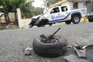 Según informan agentes de la Policía Nacional, los dos oficiales que se encontraban dentro del vehículo resultaron con laseraciones en diferentes partes del cuerpo debido al impacto producido.