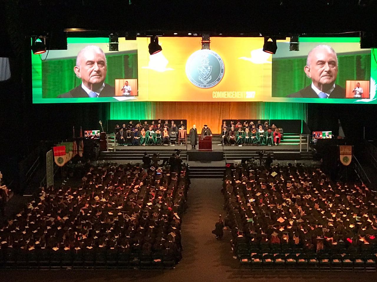 Ante cerca de 700 jóvenes, el empresario dictó el discurso de apertura de la ceremonia de graduación de la Generación 2017 de los Colegios de Negocios e Ingeniería, a quienes a través anécdotas y experiencias, compartió algunas lecciones empresariales clave que lo han acompañado a lo largo del tiempo; como lo son el poder de las ideas, la importancia de la constancia y de no temer a arriesgarse. «Algunas buenas ideas pueden llegar como un relámpago; pero la mayoría de ellas son el resultado del ensayo y el error, de la colaboración y del trabajo duro”, destacó Cisneros.