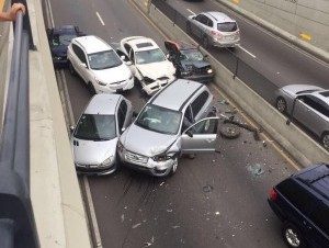Seis vehículos chocaron la mañana de este jueves en la avenida 27 de Febrero esquina Privada, en el Distrito Nacional. Una señora quedo atrapada dentro de uno de los vehículos accidentados.