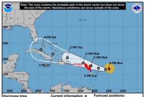 Irma se está moviendo hacia el oeste a una velocidad de traslación de 13 millas por hora (20 km/h) y se espera que su trayectoria de un giro hacia el oeste noroeste haciendo que el centro del huracán tocará el martes por la noche cerca o sobre el norte de las Islas de Sotavento, según pronósticos del NHC.EFE