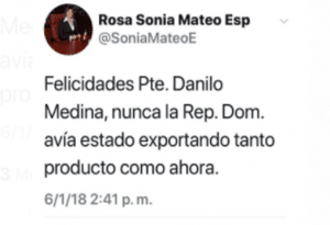 La senadora por la provincia de Dajabón, Sonia Mateo publicó este sábado en su cuenta de Twitter un mensaje felicitando al presidente Danilo Medina por la cantidad de productos que se exportan en el país, utilizando la palabra “avía” en vez de había, lo que indica un error ortográfico.