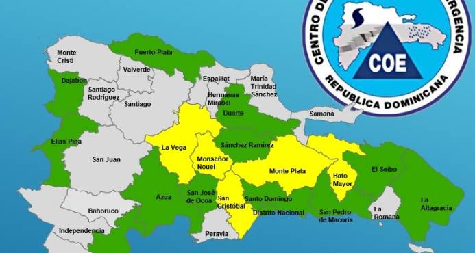 Por posibles inundaciones repentinas urbanas y rurales, crecidas de ríos arroyos y cañadas, así como deslizamientos de tierra, el COE pone en alerta amarilla las provincias: La Vega, Monte Plata, San Cristóbal, Monseñor Noel y Hato Mayor.