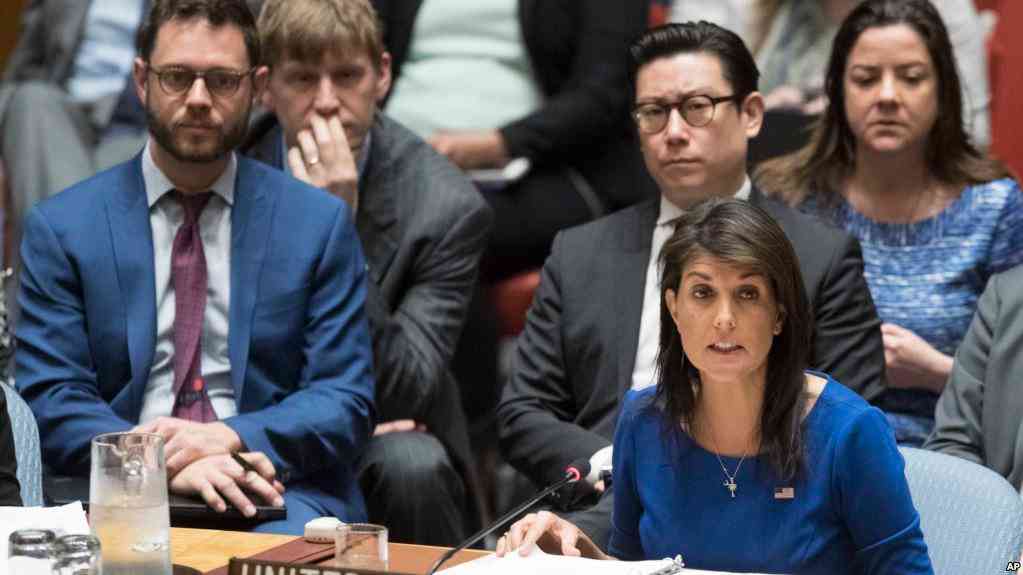 La embajadora de EE.UU. ante la ONU, Nikki Haley, habló ante el Consejo de Seguridad el sábado 14 de abril de 2018. Foto y Texto de la Voz de América.