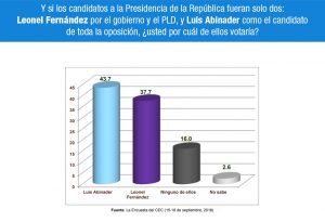 En un escenario en el que los únicos candidatos presidenciales a las próximas elecciones fueran Abinader, por el PRM y Leonel Fernández por el Partido de la Liberación Dominicana, PLD, Abinader alcanzaría un 43,7 de respaldo electoral, contra un 37.7 del aspirante oficialista Leonel Fernández, con una ventaja de 6 puntos porcentuales para el aspirante opositor frente al oficialista.