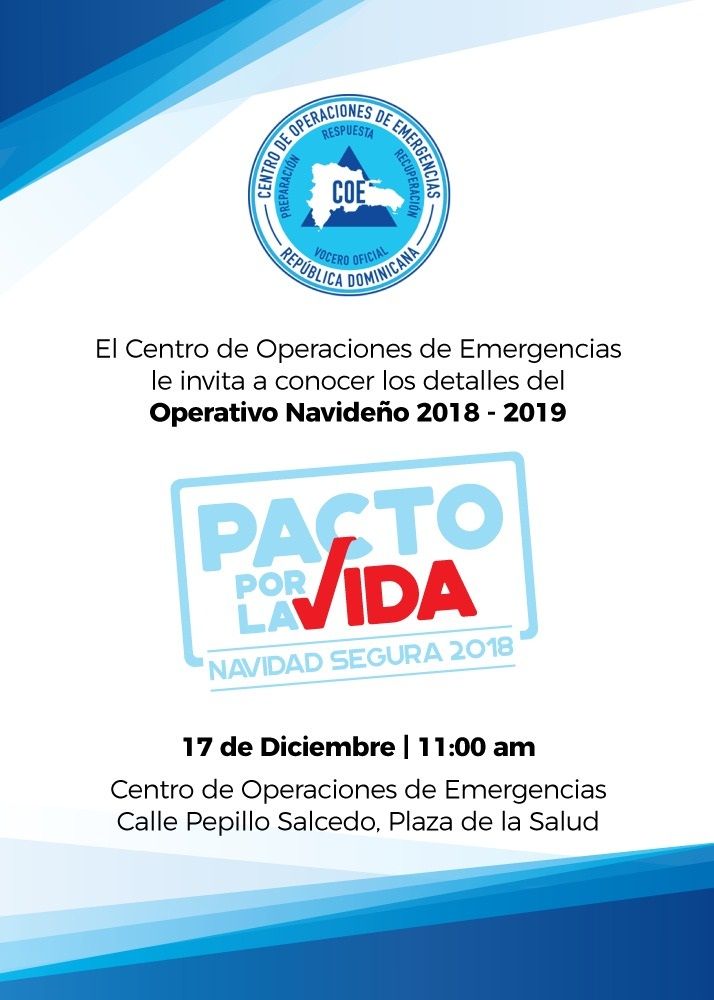 SANTO DOMINGO. El Centro de Operaciones de Emergencias (COE) iniciará este domingo la primera fase del operativo “Navidad Segura, un Pacto por la Vida 2018-2019”, el cual busca preservar vidas durante las festividades de Nochebuena y Navidad.