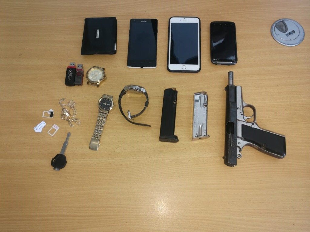 Jiménez Encarnación conducía un carro marca Hyundai, modelo Sonata, color azul, placa A-610470, en cuyo interior fueron encontradas una pistola marca Browning, calibre 9mm, serie No.G09608, con dos cargadores y 17 capsulas, un cuchillo, tres celulares, tres relojes, un anillo, así como también una cartera y un bulto con tres memorias USB, además de los 20 mil pesos en efectivo.