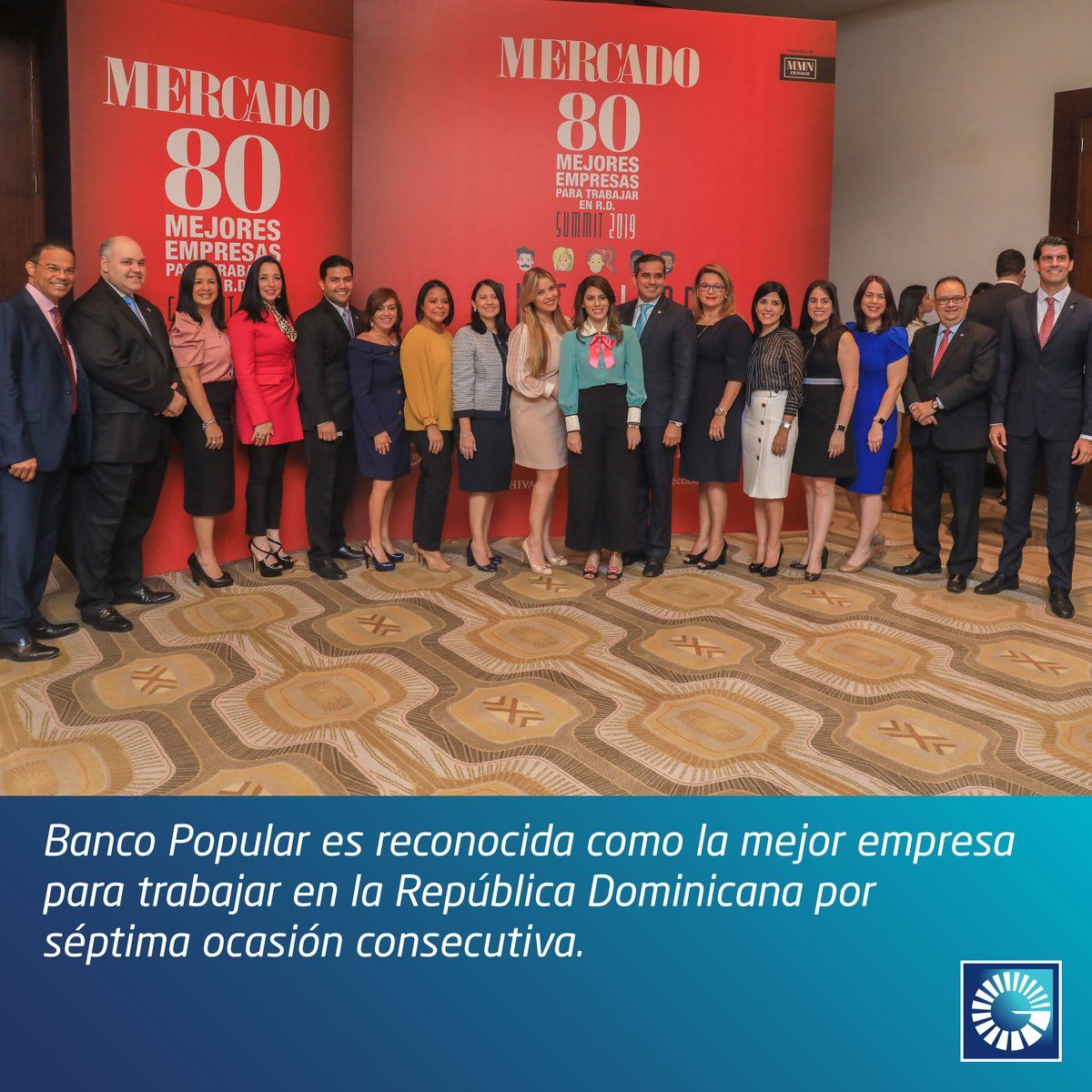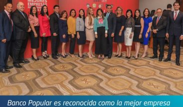 Santo Domingo, D.N.- El Banco Popular Dominicano repite, por séptima ocasión consecutiva, como la mejor empresa para trabajar en la República Dominicana, según el estudio anual realizado por la revista Mercado entre sus lectores y en el cual la organización fue elegida como una empresa líder en cuanto al manejo de la diversidad y el talento de sus colaboradores.