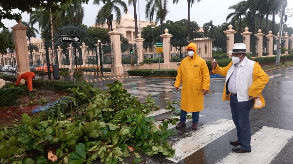 Explicó que equipos pesados y brigadas del MOPC realizan labores de limpieza de imbornales, aceras y contenes en las vías que circundan el Palacio Nacional, y viabilizan el tránsito en otras, que han sido cubiertas por ramas de árboles y otros objetos.