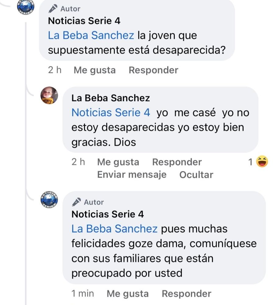 La misma ha publicado un mensaje en su cuenta de facebook en donde expresa que no se encuentra desaparecida y dice que se casó.