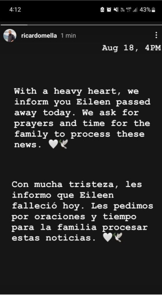 «Con mucho pesar y tristeza les informo que Eileen falleció hoy», informó el hermano de una de las víctimas en una historia colgada en su cuenta de la red social Instagram.
