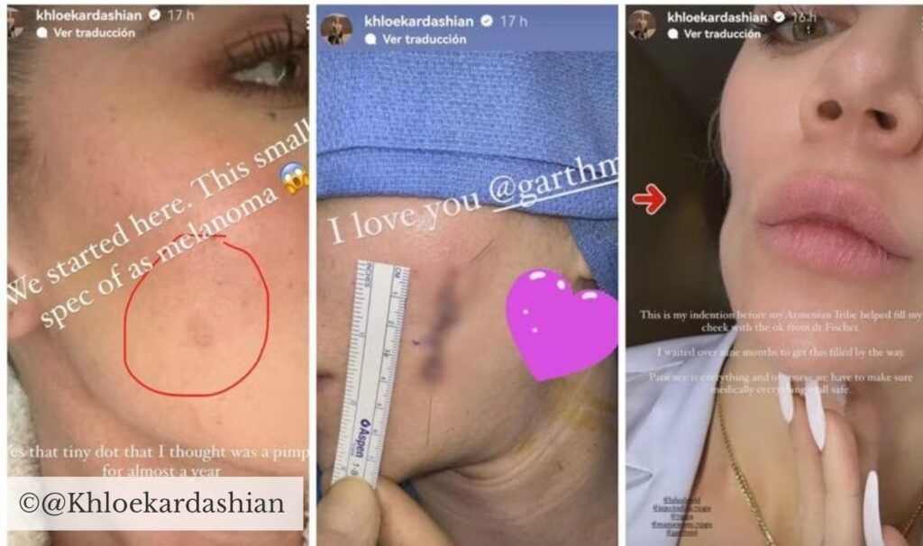 Khloé Kardashian usó sus redes sociales para compartir con sus seguidores su lucha contra el cáncer de piel, mostrando como nunca la cicatriz que esta batalla le dejó. En estas publicaciones, la empresaria también compartió el procedimiento estético al que se sometió después de la cirugía para removerle un tumor en el rostro. La menor de las hermanas Kardashian documentó la extirpación de un melanoma en su mejilla, que, según ella, le dejó dejado una hendidura algo que, lejos de acomplejarla, la hace sentir fortalecida.
