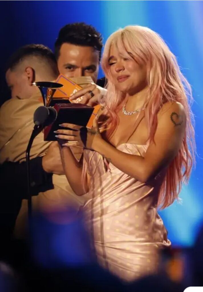SEVILLA, 16/11/2023.- La cantante colombiana Karol G (d) recibe el premio al Mejor Álbum del Año por ‘Mañana será bonito’, durante la gala anual de los Latin Grammy celebrada este jueves en Sevilla.