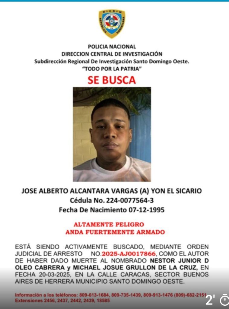 *La Policía Nacional emitió este sábado una alerta de búsqueda y captura contra tres reconocidos delincuentes señalados como los presuntos responsables del asesinato de Néstor Junior D’Óleo Cabrera y Michael Josué Grullón de la Cruz, ocurrido el jueves 20 de marzo en la calle Caracas, sector Buenos Aires de Herrera, Santo Domingo Oeste.