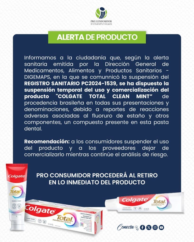 Pro Consumidor y Digemaps anuncian retiro y prohibición comercialización de pasta dental Colgate Total