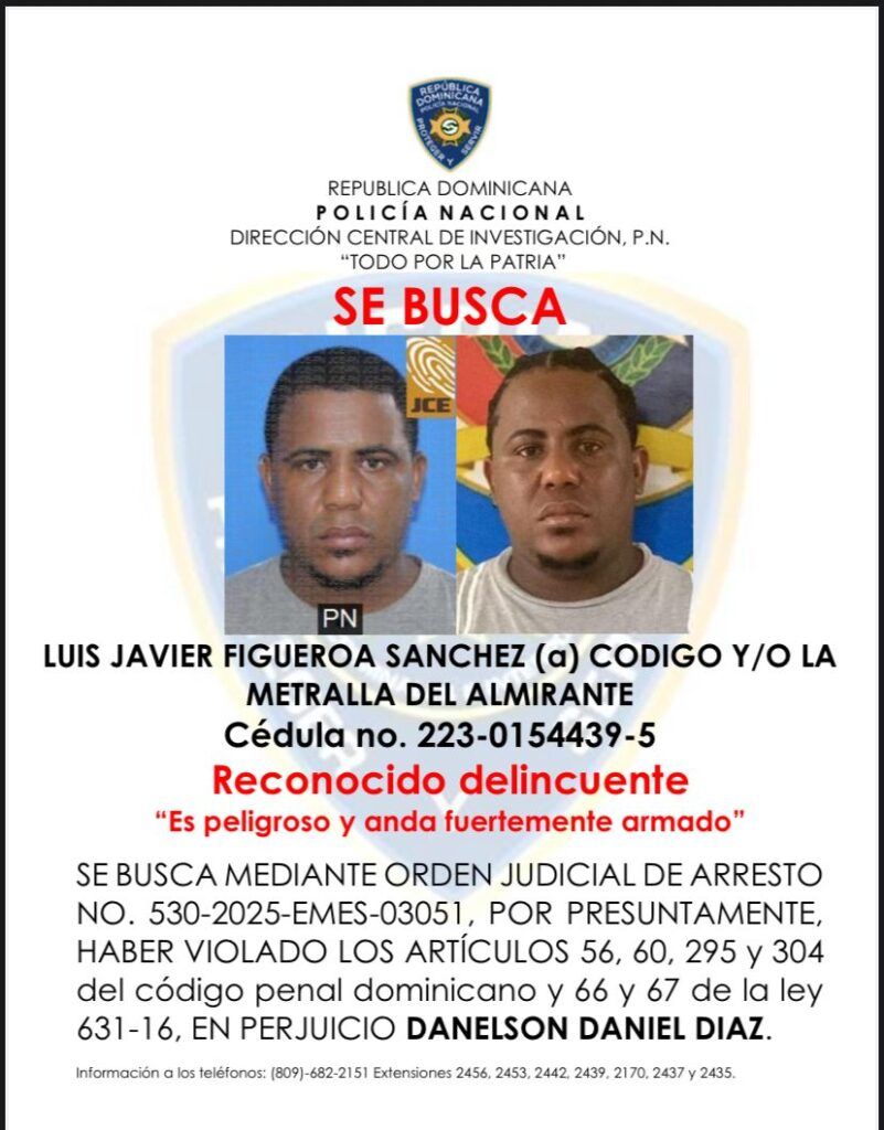 Santo Domingo Este*La Policía Nacional informa que, tras labores investigativas, fueron identificados los presuntos responsables de la muerte de Danelson Daniel Díaz, ocurrida a las 02:00 de la madrugada del pasado 18 de noviembre de 2025, en la calle Yolanda Guzmán, sector El Almirante, Santo Domingo Este.En la escena, el personal actuante confirmó el fallecimiento del ciudadano, quien presentó heridas por proyectil de arma de fuego.