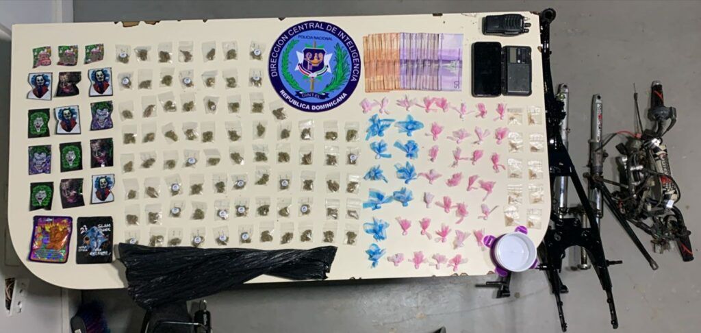 En el sector Mi Vivienda, Hato del Yaque, fue apresado Euri Reyes Hilario (a) El Flaco, a quien se le ocuparon 94 porciones de presunta marihuana, 43 de presunta cocaína, 10 de presunto molí, además de una balanza, un radio de comunicación, un celular, RD$900 en efectivo y un chasis de motocicleta sin numeración.