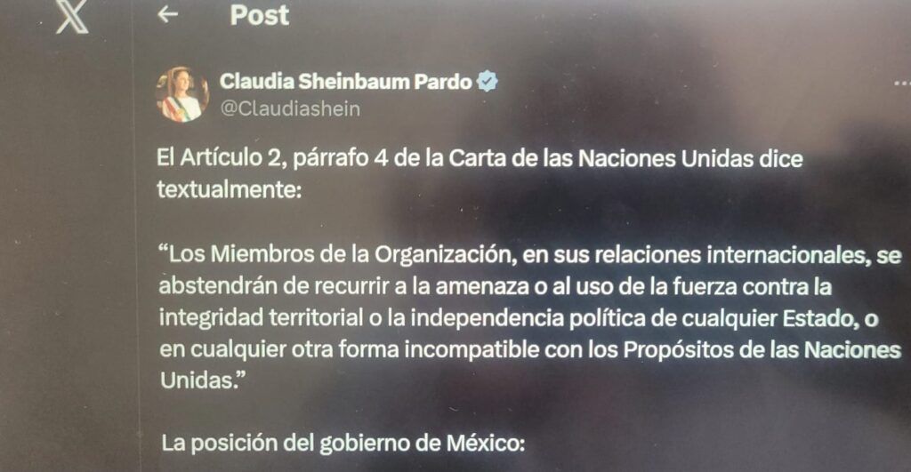 A través de sus redes sociales, expresó la postura del gobierno mexicano y recordó lo establecido en la Carta de las Naciones Unidas, citando el Artículo 2, párrafo 4, que señala que los Estados deben abstenerse del uso de la fuerza contra la soberanía e integridad territorial de otros países.