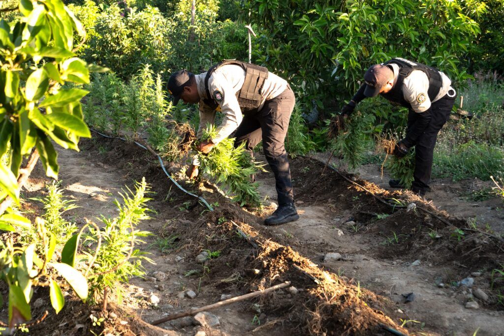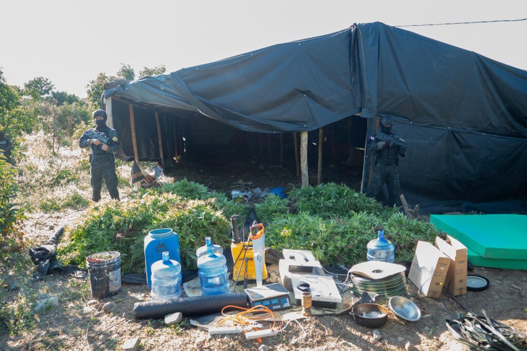 Al incursionar en el área con helicópteros y unidades terrestres, se localizaron un total de 1,835 plantas de marihuana, de aproximadamente dos metros de altura, dos cubetas llenas del vegetal, cinco extractores, cuatro extensiones eléctricas, un bomba de regadío, un martillo, una pinza, un tanque, tres botellones de agua, dos colcha espuma, una carretilla, rollos de tela, un serrucho, varios garrafones de combustible, entre otras evidencias.